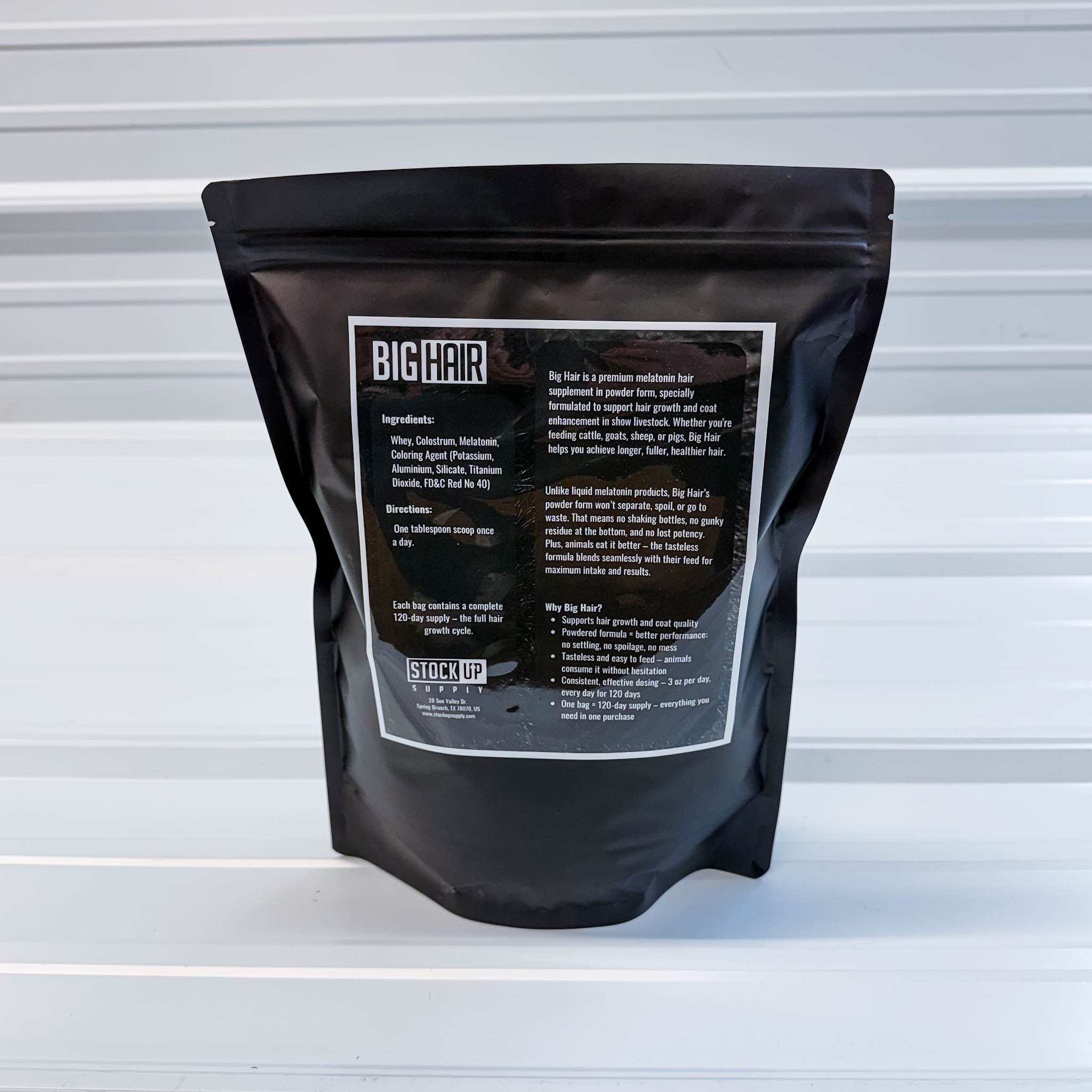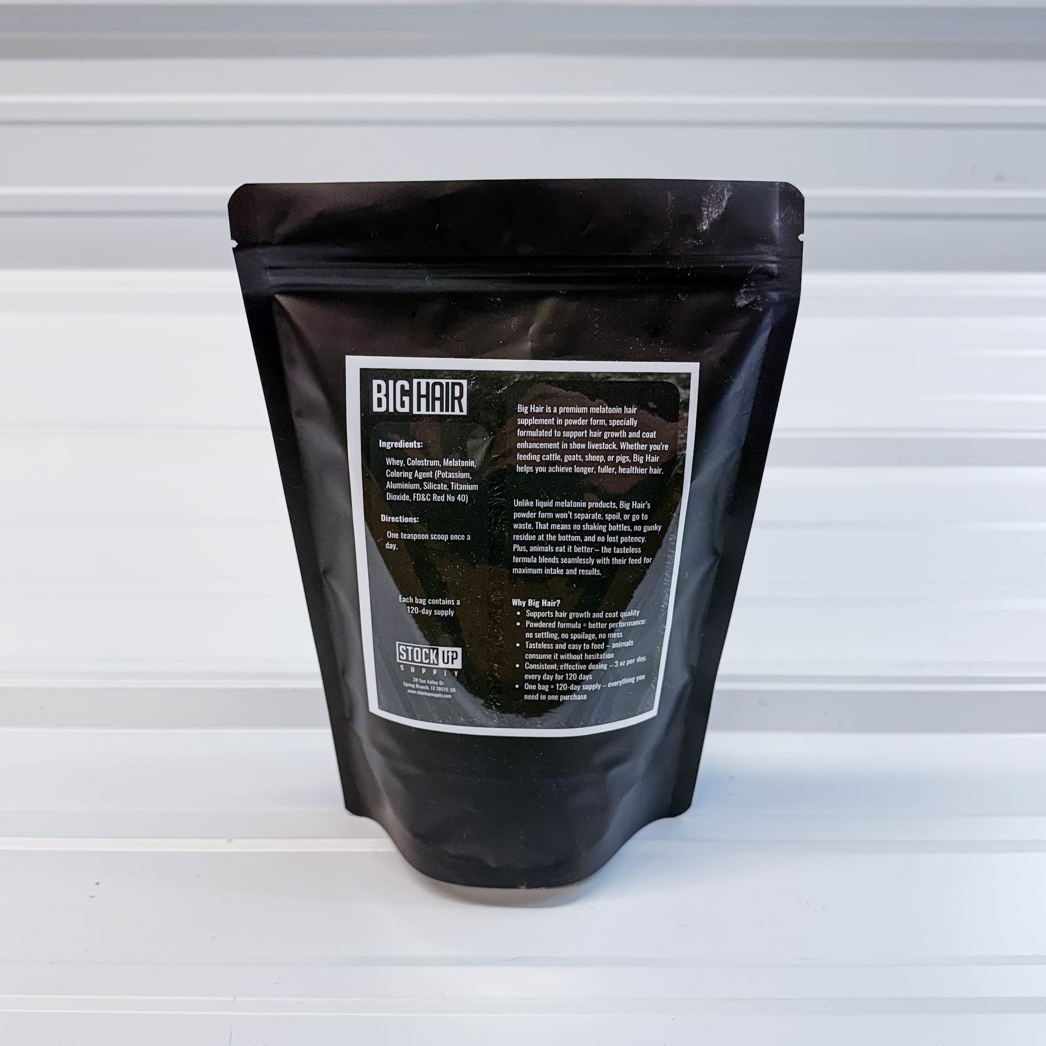 Big Hair is a premium powdered melatonin supplement designed as a nutritional supplement for farm animals. Built specifically for exhibitors, it delivers consistent support for cattle, goats, sheep, and pigs during the critical hair growth cycle.